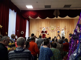 Проживающие очень ждали новогодний праздник и поэтому без опоздания собрались у нарядной елки с отличным настроением, где их уже ждали Дед Мороз, Снегурочка и Мышонок. В зале царила по-настоящему праздничная атмосфера. Участники мероприятия водили хороводы вокруг елки, играли в игры, танцевали, пели песни и рассказывали стихи. Каждый из них получил сладкий сюрприз. А в завершение праздника состоялась новогодняя дискотека.