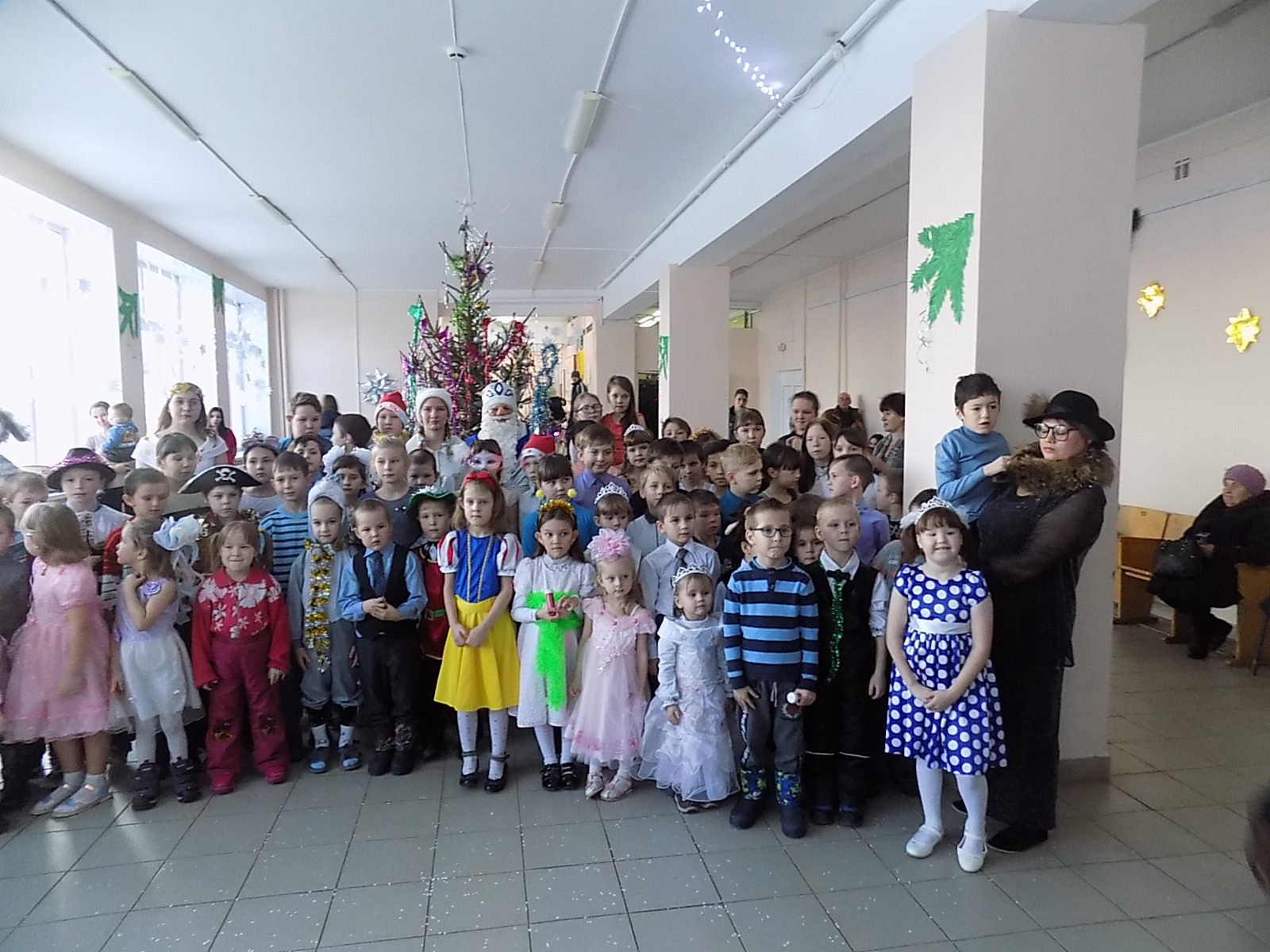 На празднике ребят развлекали Баба Яга, Кикимора и, конечно, главные герои Нового года - Дед мороз и Снегурочка. Дети вместе со сказочными героями водили хороводы, пели новогодние песни, танцевали и рассказывали стихи. Все участники зарядились хорошим настроением и позитивом на весь год.