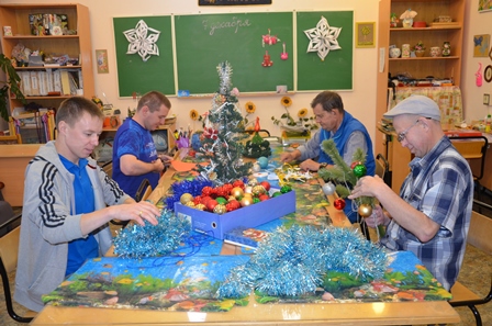 Реабилитанты с энтузиазмом вырезали снежинки, изготавливали гирлянды, готовили детали для новогодних композиций. Приступили к украшению холла и входной группы Центра. Уже поставили и нарядили красавицу-елку, украсили окна, стены. Мишура, игрушки, резные снежинки – важные атрибуты для встречи долгожданного дня. Своими руками нам удалось создать теплую домашнюю атмосферу. Предновогодняя суета, но сколько приятных моментов!