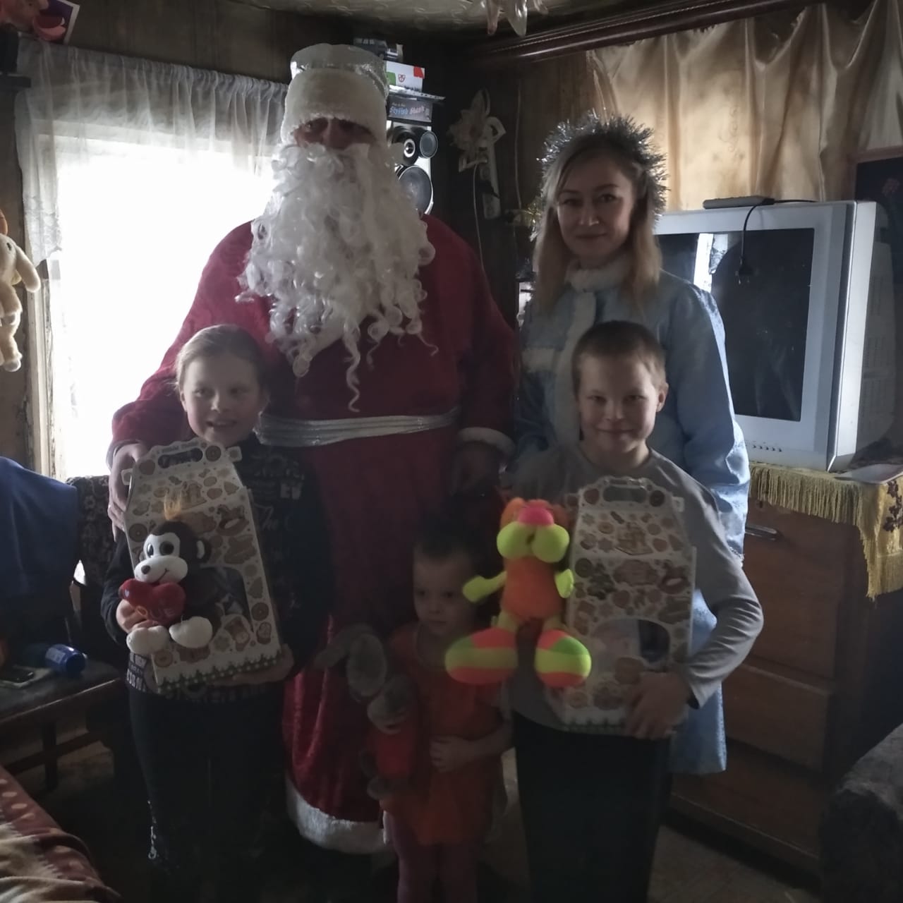 26 декабря Дед Мороз и Снегурочка подарили новогодние подарки 27 детям. Радостные детские лица, светящиеся глаза и улыбки малышей встречали Дед Мороз и Снегурочка в каждом доме. Ребята читали Дедушке Морозу стихи, и старались его удивить своими знаниями.